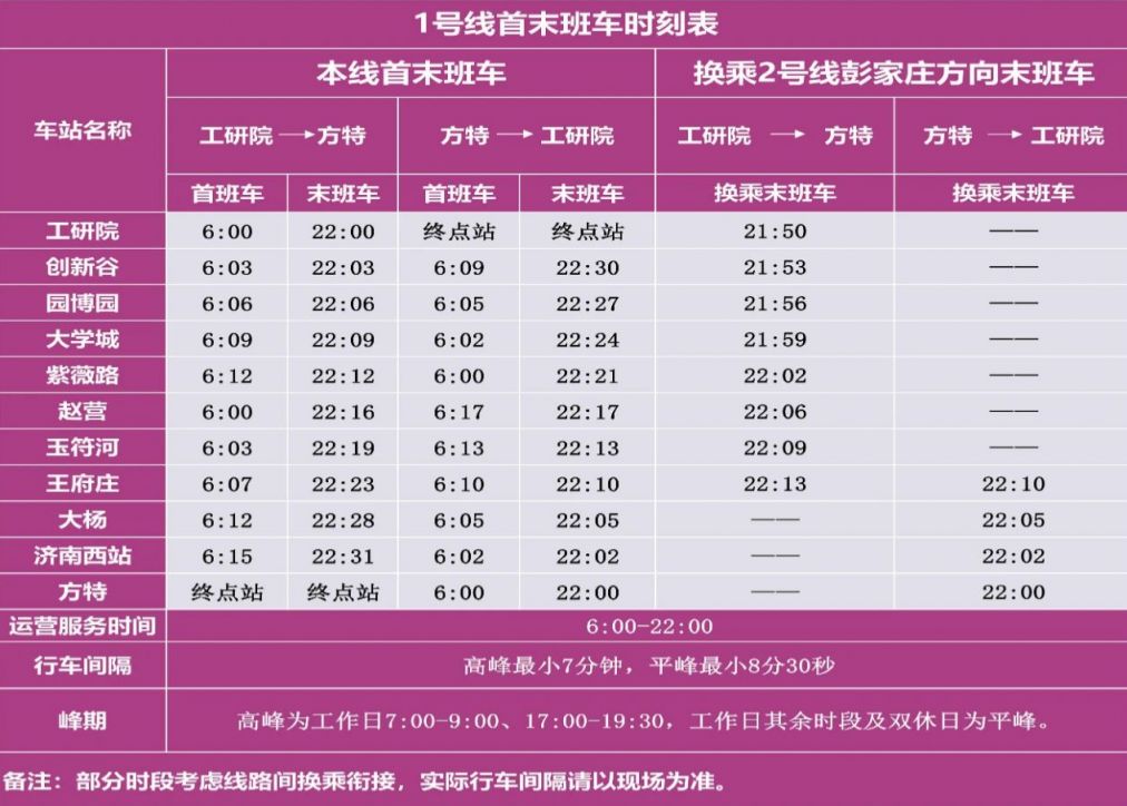 3. "运营时间":济南地铁1号线工作日运营时间为06:00-22:00,周末及节假日运营时间为06:00-22:30。
