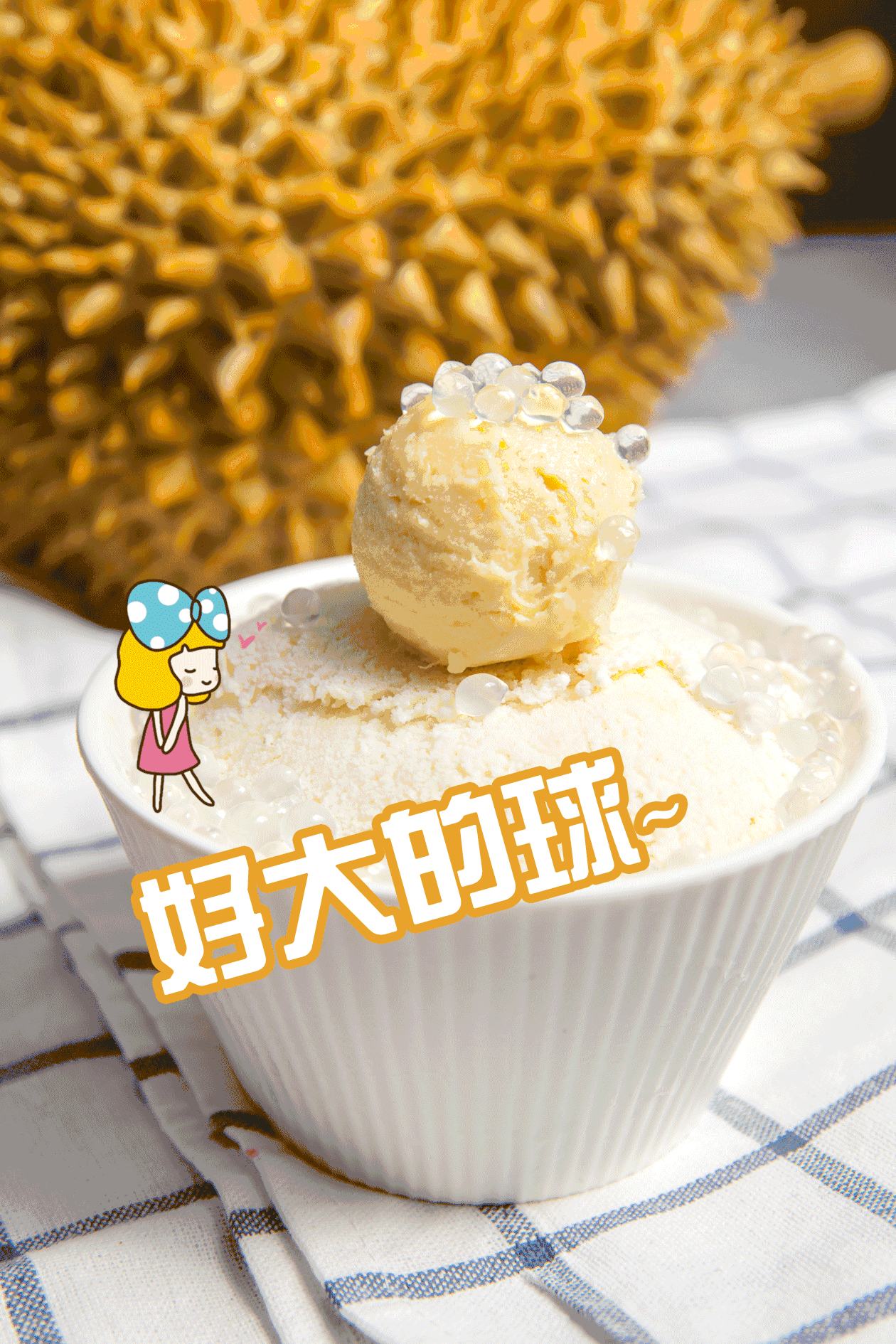 一大颗榴莲冰球屹立在冰沙上
