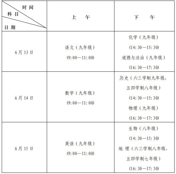 初中学业水平考试实行“学完即考”,初中学校根据课程设置方案组织学生参加相应学科考试。原则上,五四学制的七年级学业水平考试科目为地理,八年级学业水平考试科目为历史、生物,九年级学业水平考试(考查)科目为语文、数学、英语、物理、化学、道德与法治、体育与健康、综合实验操作、艺术和综合实践活动。六三学制的八年级学业水平考试科目为生物、地理,九年级学业水平考试(考查)科目为语文、数学、英语、物理、化学、道德与法治、历史、体育与健康、综合实验操作、艺术和综合实践活动。2025年,五四学制和六三学制的八年级、九年级学生,均参加信息科技考试。自2026年起,按照《义务教育课程方案和课程标准(2022年版)》要求,五四学制和六三学制学生均在八年级参加信息科技考试。