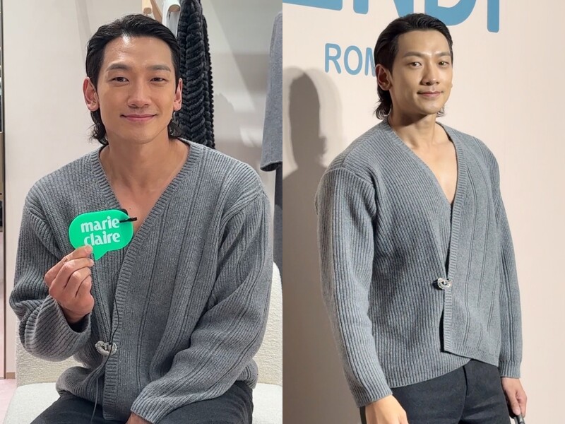 Rain时隔5年再度来台出席FENDI女装专门店开幕活动,不同于抵台时的一身帅气黑色系造型,换上灰蓝色羊绒开襟衫,并巧妙以水晶造型别针收合上衣,V字领口隐约透出壮实的肌肉线条,搭配秋冬新包款Peekaboo Soft,全后梳的湿髪造型散发都会时髦气息,出场时更是亲切放送粉丝福利,并诚意十足的以秀中文打招呼: