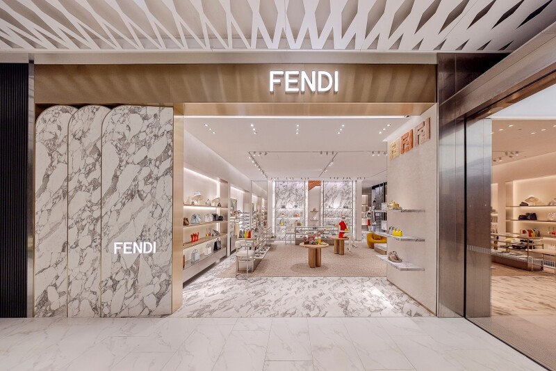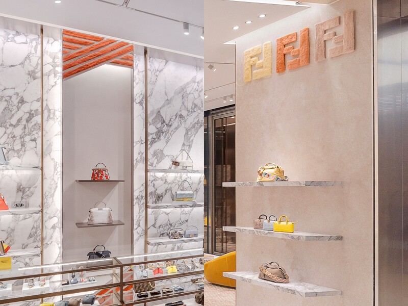 店内墙面自古罗马建筑中汲取灵感,融入了一系列古典大理石拱门,配以香槟色金属细节,一楼入口处墙面上有三块罗马FENDI皮草工坊手工製作的皮草饰片FF LOGO挂饰,特殊展示柱也採用FENDI Astuccio 经典工艺皮草打造的独特条纹图案皮草装饰。