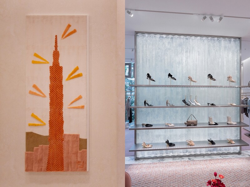 店内二楼有一面由义大利玻璃工坊特别订製、以罗马喷泉水波纹为概念打造的玻璃墙,展示各款鞋履,墙上也搭配着由FENDI罗马皮草工坊製作的台北101作品。