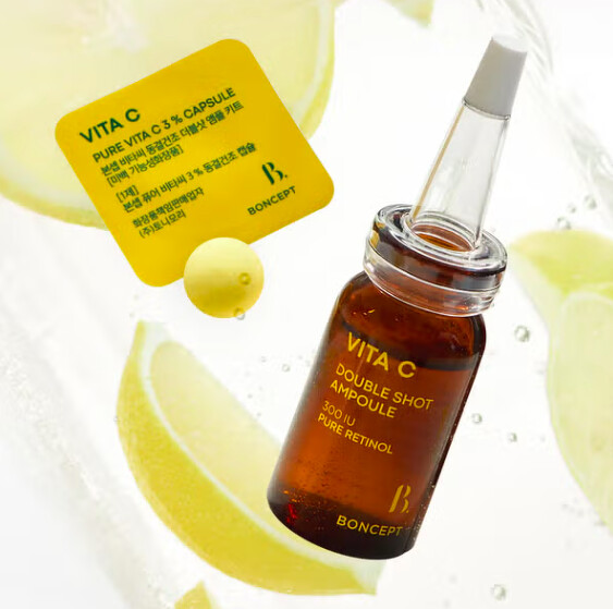 这款维他命C安瓶精华(VITA C Double Shot Ampoule Kit/본셉 비타씨 동결 건조 더블샷 앰플 키트)除了含有3%的纯维他命C外,还含有300IU的A醇和玻尿酸,不仅能改善肌肤暗沉和斑点外,还能帮助改善肌肤弹力和保湿,是DAISO员工盛讚虽然只卖韩币5,000元却有着超越其价值的超热卖产品。